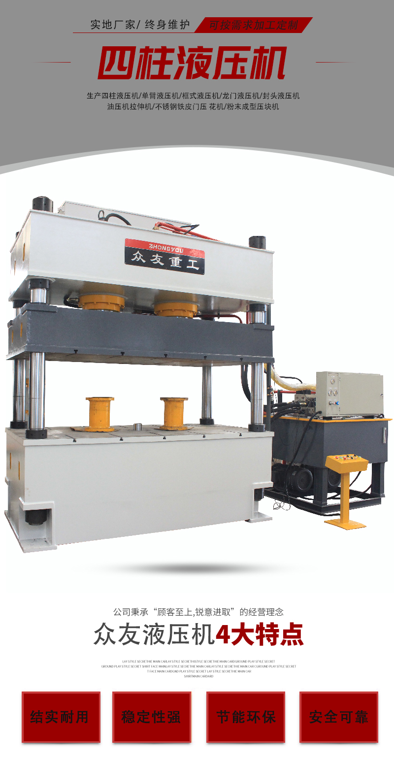 500吨金属成型液压机是山东九州体育ju11net有限公司自主研发生产设计的双缸液压机,设备由主机及控制机构两大部分组成,通过管路及电气装置联系起来构成整体。主机部分包括机身、主缸、限程装置等。控制机构包括液压泵站(动力系统)、电器箱、移动操纵台等组成。四柱式结构为压力机很常见的结构形式之一,它的显著特点是工作空间宽敞,便于四身观察和接近模具,整机结构简单,工艺性好