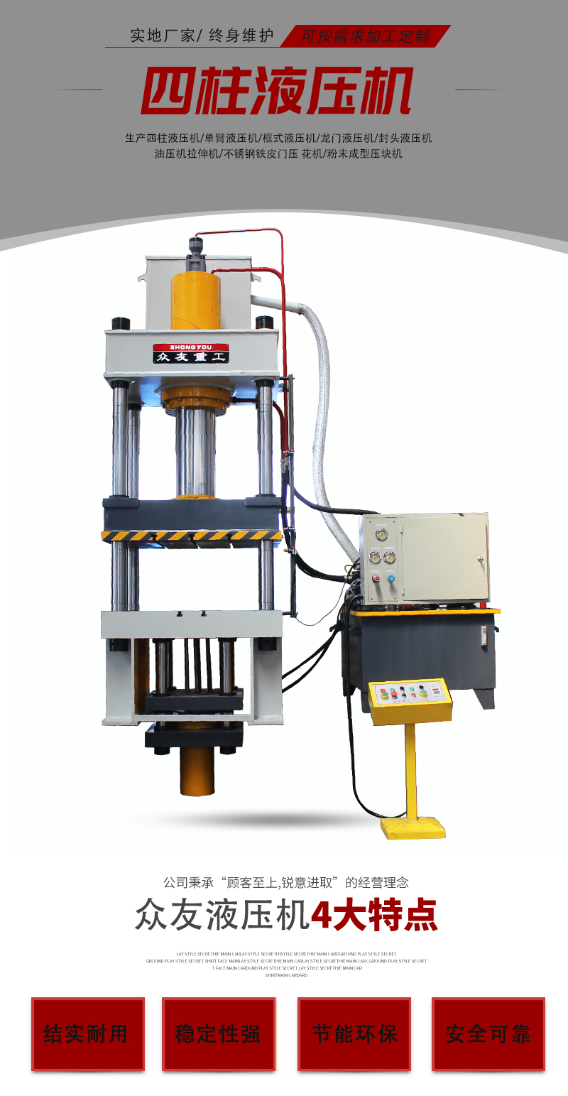 2、采用四柱导向结构,导向精度高,抗侧向力强,适用于压制精度要求高、不对称产品