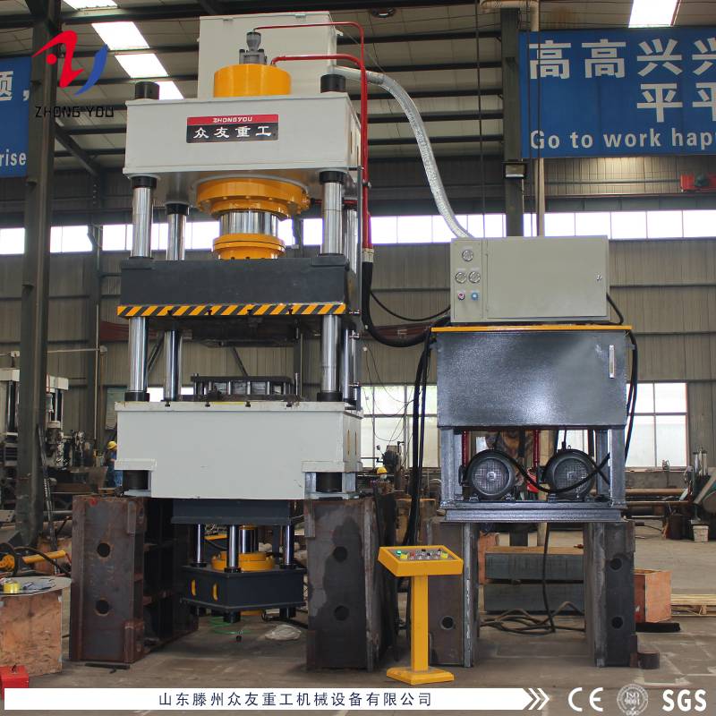 500吨金属托盘拉伸成型液压机是山东众友重工为俄罗斯企业定制生产的一款三梁四柱液压机,机身采用三梁四柱式结构,主要由:上横梁、滑块、工作台、四根立柱、主缸、电气系统及液压系统等组成。设备由主机及控制机构两大部分组成,通过管路及电气装置联系起来构成整体。主机部分包括机身、主缸、限程装置等。控制机构包括液压泵站(动力系统)、电器箱、移动操纵台等组成。活动梁板二段速度控制:空载快速、慢速靠模拉深,提高产品的出产成功率,降低产品废品率