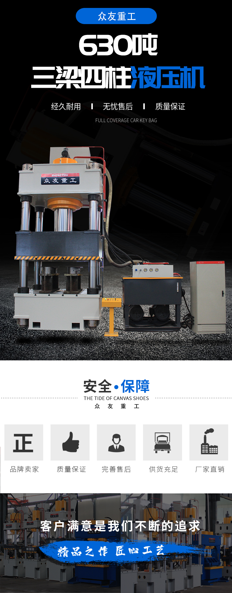 630吨多功能金属拉伸液压机是山东九州体育ju11net有限公司自主研发生产设计的,设备由主机及控制机构两大部分组成,通过管路及电气装置联系起来构成整体。主机部分包括机身、主缸、限程装置等。控制机构包括液压泵站(动力系统)、电器箱、移动操纵台等组成。三梁四柱液压机广泛适用于紧固件厂、汽车维修、五金行业、车件公司、矿业、电子元件、表带、首饰、灯饰、照明、手机外壳、泵业、电器设备等行业