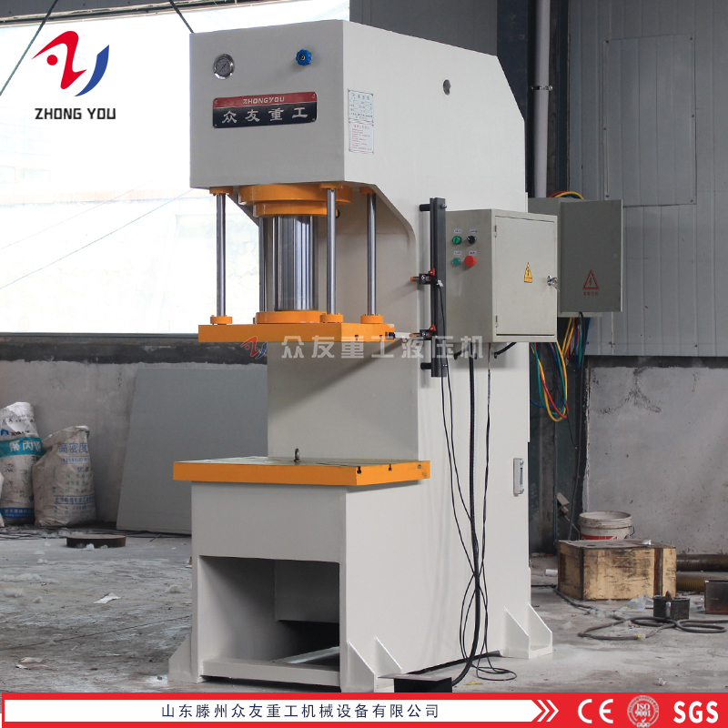 100吨单臂液压机所用的工作介质的作用不仅是传递压强,而且保证机器工作部件工作灵敏、可靠、寿命长和泄漏少。100吨单柱液压机对工作介质的基本要求是:①有适宜的流动性和低的可压缩性,以提高传动的效率;②能防锈蚀;③有好的润滑性能;④易于密封;⑤性能稳定,长期工作而不变质。本系列压力机全部采用钢板焊接结构,机器强度高,精度稳定并有长期的保持性,该机装有液压过载保护装置,利用三面空间,可拓宽工作范围,也可根据用户要求定做生产