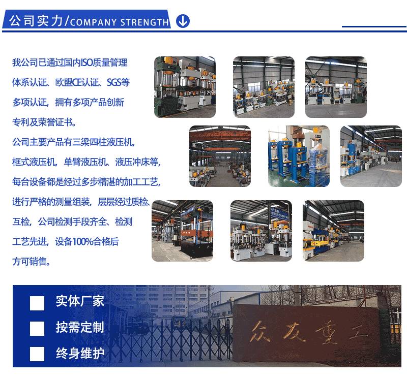 滕州九州体育ju11net设备有限公司是我国液压机、压力机专业生产企业之一, 公司拥有大型落地镗铣床、重型车床、铣床刨床等设备,工艺装备先进,专业生产常规液压机、四柱液压机、小型液压机、单臂液压机、多功能液压机、框式液压机、龙门液压机、卧式液压机、三梁四柱液压机各类液压机及汽保设备。公司与多家国有大型企业、独资合资及民营企业服务配套数十台,深受用户欢迎