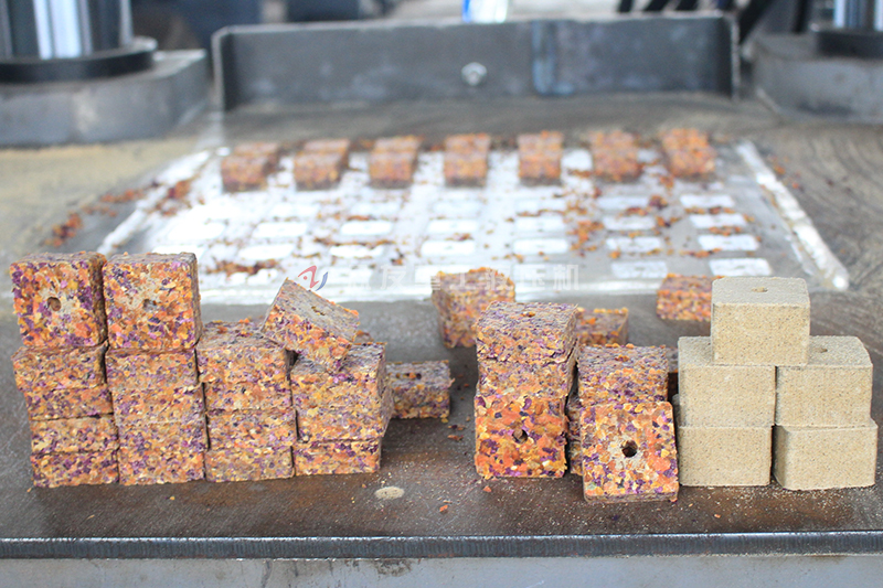 模具体下部油缸向上移动,移动距离需要根据原材料的压缩比计算,一个布料箱开始工作,将物料布满模具框内然后后退,主油缸下行轻微压制下与饵料,然后上行,第二个布料箱开始工作,将另外一种料布满在料箱内,然后后退,主油缸快速下行加压成型,保压几秒钟,模具体下部油缸下行,从而实现鱼饵块脱模,推块系统工作,将鱼饵块推出,这样一个过程就完成了,依次循环,实现连续生产