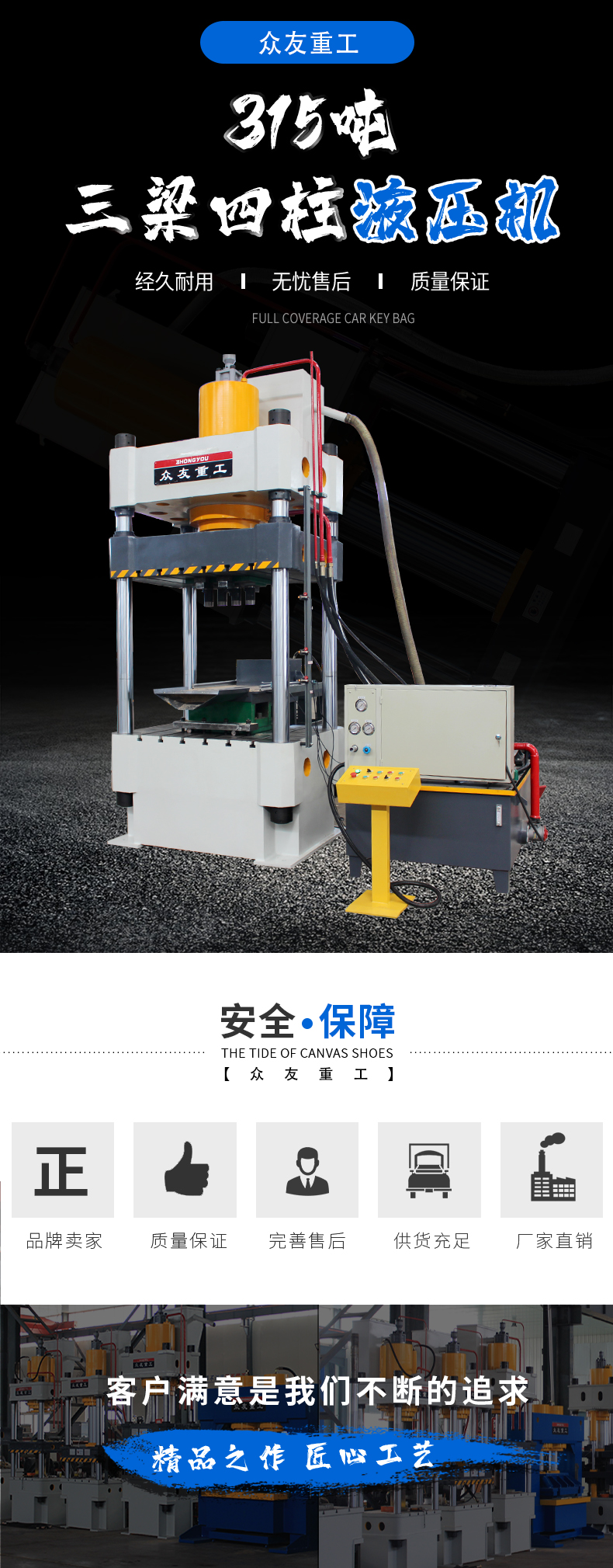 315T金属粉末压块液压机是液压机厂家山东滕州众友重工自主设计生产的液压机,根据产品及工艺要求为客户专业生产设计,用于金属粉末压块成型。从结构上看,315吨粉末成型油压机属于三梁四柱液压机的一种,系统动作快,转向快,节能稳定性好,更有利于力的均匀分布,保证成品的效率,降低次品率,了解更多机器细节或者来我厂参观,欢迎致电