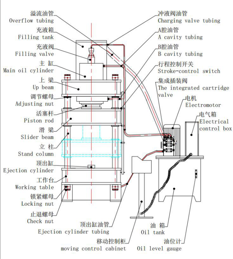 本机器由主机及控制机构两大部分组成,通过管路及电气装置联系起来构成整体。主机部分包括机身、主缸、限程装置等。控制机构包括液压泵站(动力系统)、电器箱、移动操纵台等组成。现将个部分结构和作用分述如下: