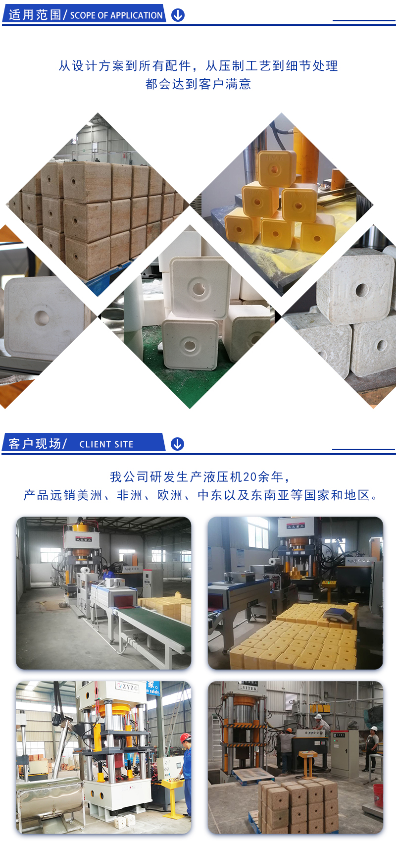 我公司生产的牛羊营养舔砖液压机是一种液压压块机设备,属于粉末成型液压机的一种,压力大,能一次成型,压制密度大,压制出的产品外观光洁美观。如果客户想生产不同规格的产品,可以定制多套模具,实现了一机多用的目标。
