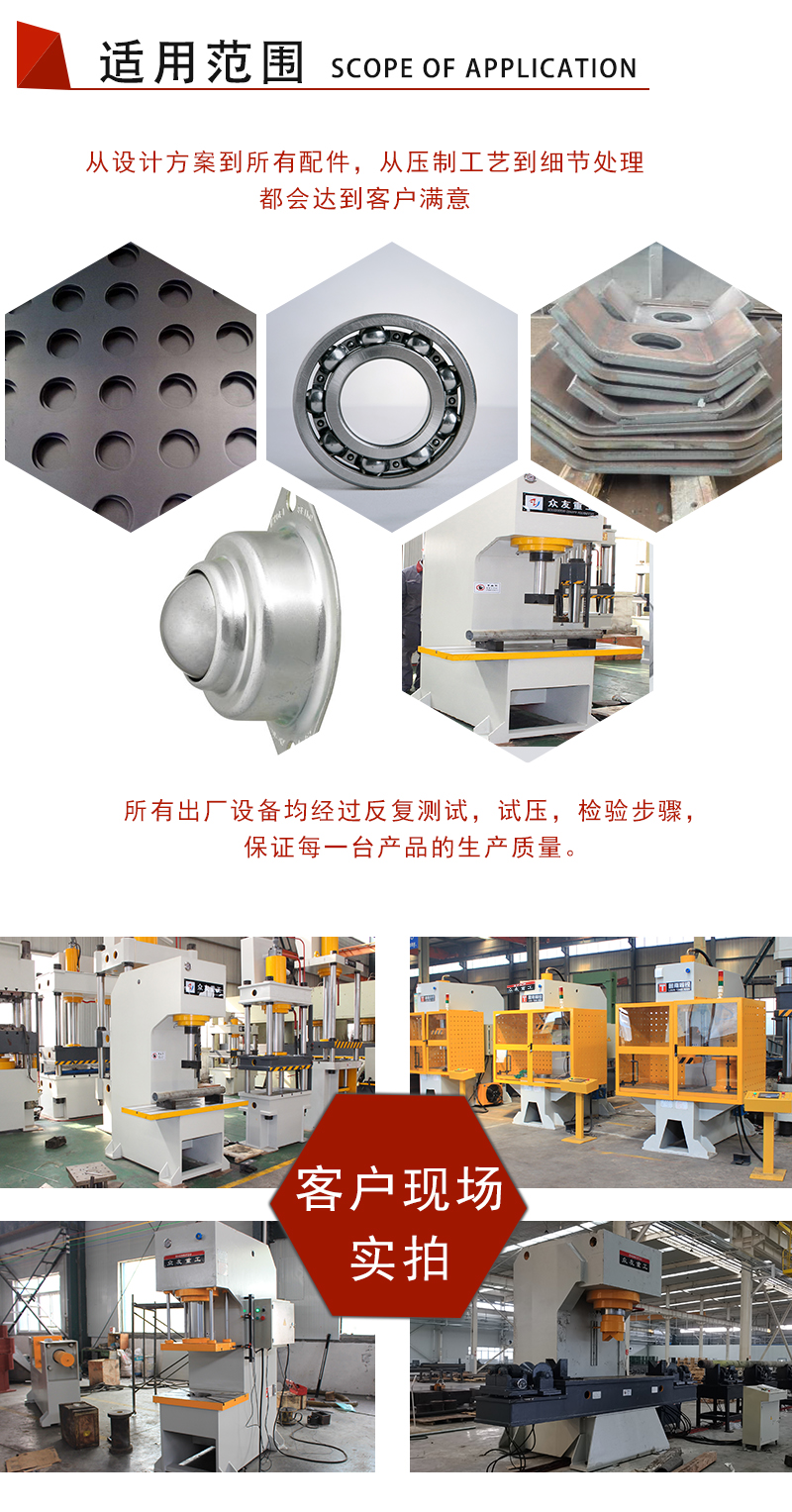 本系列液压机适用于轴类零件、型材的校直和轴承、轴套类零件的压装,板材零件的弯曲、压印,简单零件的冲压、拉伸。还可用于机床、内燃机、轻纺机械、轴类、轴承、洗衣机、汽车电机、空调电机、电器等行业的装配流水线