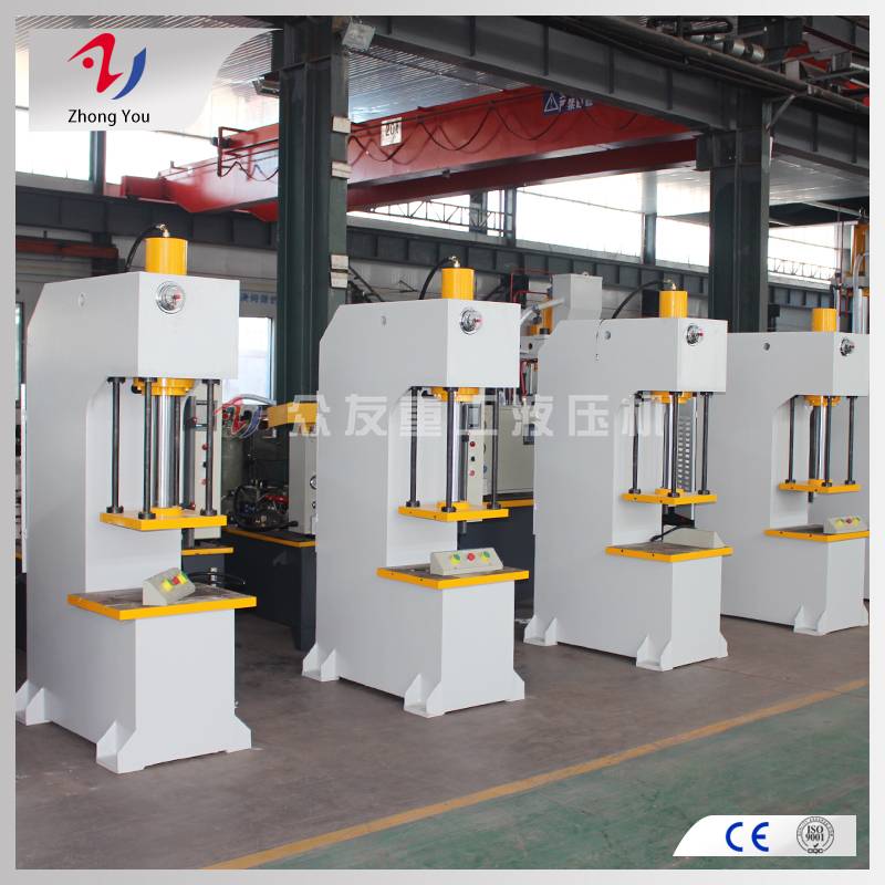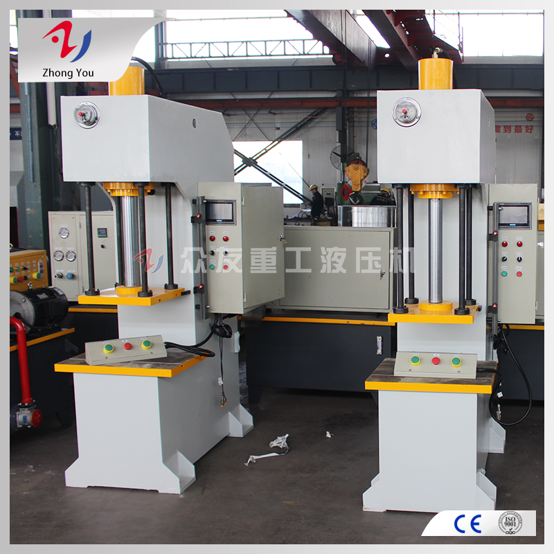 30吨带四柱导向单柱液压机也叫单臂液压机,是山东滕州众友重工液压机厂家生产的一款30吨单柱液压机,该型号液压机为“C”型单臂式机身结构,采用埋弧焊焊接,机身全钢板焊接,焊接后通过振动处理,以保证机身的不变形程度。液压系统布置在机身内,按钮集中控制,可实现调整、手动、半自动操作方式,操作方便。工作压力行程可在规定范围内调节