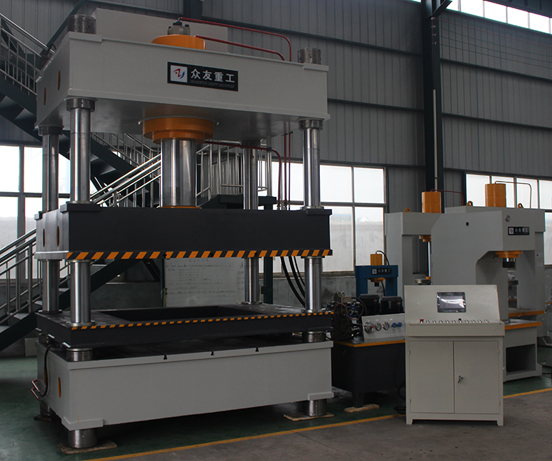 复合成型成型液压机 性能特点: 这台400吨四梁四柱硅酸钙板成型液压机机身采用四梁四柱式结构,液压系统采用插装阀集成控制。 独立可靠的电控系统,具有广泛的通用性,适用于复合材料的压制加工和成型;能够根据用户参数需求进行设计生产,更好的配合用户工艺需求。 可实现定程、定压二种成形工艺,并具有保压延时等性能,应用广泛、经济性好。 此外,如果液压机用于落料,冲裁等工艺,应该加装冲裁缓冲装置,以消除或减轻材料冲断瞬间的冲击和噪音。